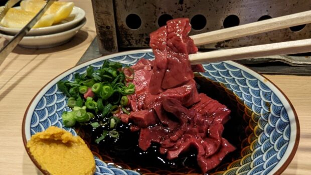 yakiniku-yuji_0039TwitterFacebookはてブPocketLINEコピー 2025.11.25東京渋谷 炭火焼 ゆうじ、おまかせ、生ビール(黒ラベル)/枝豆付き、カットレモン、刺身各種(ハツ刺し[特製醬油タレ、辛子])、キムチ・ナムル(ほうれん草、舞茸)、煮込み、レバー、ホルモン(ごま油、ねぎ、ごま)、牛カシラ、ハラミ、上ミノ、マッコリ、焼きすき ※牛脂付き(サーロインを大きな薄切りに切り出し、特製タレに漬けてた一品。)、牛すじカレー、モナカアイス