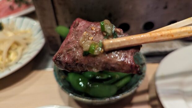 yakiniku-yuji_0060TwitterFacebookはてブPocketLINEコピー 2025.11.25東京渋谷 炭火焼 ゆうじ、おまかせ、生ビール(黒ラベル)/枝豆付き、カットレモン、刺身各種(ハツ刺し[特製醬油タレ、辛子])、キムチ・ナムル(ほうれん草、舞茸)、煮込み、レバー、ホルモン(ごま油、ねぎ、ごま)、牛カシラ、ハラミ、上ミノ、マッコリ、焼きすき ※牛脂付き(サーロインを大きな薄切りに切り出し、特製タレに漬けてた一品。)、牛すじカレー、モナカアイス