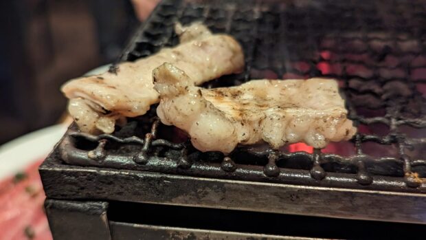 yakiniku-yuji_0067TwitterFacebookはてブPocketLINEコピー 2025.11.25東京渋谷 炭火焼 ゆうじ、おまかせ、生ビール(黒ラベル)/枝豆付き、カットレモン、刺身各種(ハツ刺し[特製醬油タレ、辛子])、キムチ・ナムル(ほうれん草、舞茸)、煮込み、レバー、ホルモン(ごま油、ねぎ、ごま)、牛カシラ、ハラミ、上ミノ、マッコリ、焼きすき ※牛脂付き(サーロインを大きな薄切りに切り出し、特製タレに漬けてた一品。)、牛すじカレー、モナカアイス