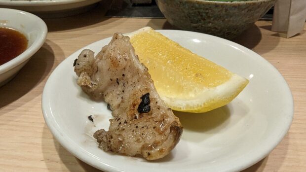 yakiniku-yuji_0070TwitterFacebookはてブPocketLINEコピー 2025.11.25東京渋谷 炭火焼 ゆうじ、おまかせ、生ビール(黒ラベル)/枝豆付き、カットレモン、刺身各種(ハツ刺し[特製醬油タレ、辛子])、キムチ・ナムル(ほうれん草、舞茸)、煮込み、レバー、ホルモン(ごま油、ねぎ、ごま)、牛カシラ、ハラミ、上ミノ、マッコリ、焼きすき ※牛脂付き(サーロインを大きな薄切りに切り出し、特製タレに漬けてた一品。)、牛すじカレー、モナカアイス