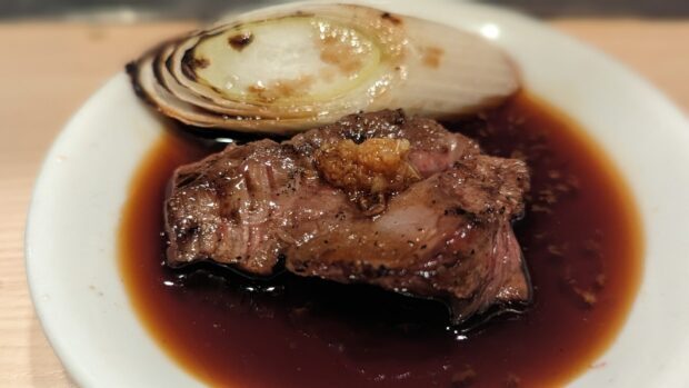 yakiniku-yuji_0085TwitterFacebookはてブPocketLINEコピー 2025.11.25東京渋谷 炭火焼 ゆうじ、おまかせ、生ビール(黒ラベル)/枝豆付き、カットレモン、刺身各種(ハツ刺し[特製醬油タレ、辛子])、キムチ・ナムル(ほうれん草、舞茸)、煮込み、レバー、ホルモン(ごま油、ねぎ、ごま)、牛カシラ、ハラミ、上ミノ、マッコリ、焼きすき ※牛脂付き(サーロインを大きな薄切りに切り出し、特製タレに漬けてた一品。)、牛すじカレー、モナカアイス