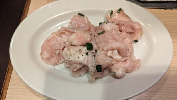 東京渋谷 炭火焼 ゆうじ、おまかせ、生ビール(黒ラベル)/枝豆付き、カットレモン、刺身各種(ハツ刺し[特製醬油タレ、辛子])、キムチ・ナムル(ほうれん草、舞茸)、煮込み、レバー、ホルモン(ごま油、ねぎ、ごま)、牛カシラ、ハラミ、上ミノ、マッコリ、焼きすき ※牛脂付き(サーロインを大きな薄切りに切り出し、特製タレに漬けてた一品。)、牛すじカレー、モナカアイス