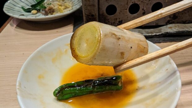 yakiniku-yuji_0109TwitterFacebookはてブPocketLINEコピー 2025.11.25東京渋谷 炭火焼 ゆうじ、おまかせ、生ビール(黒ラベル)/枝豆付き、カットレモン、刺身各種(ハツ刺し[特製醬油タレ、辛子])、キムチ・ナムル(ほうれん草、舞茸)、煮込み、レバー、ホルモン(ごま油、ねぎ、ごま)、牛カシラ、ハラミ、上ミノ、マッコリ、焼きすき ※牛脂付き(サーロインを大きな薄切りに切り出し、特製タレに漬けてた一品。)、牛すじカレー、モナカアイス