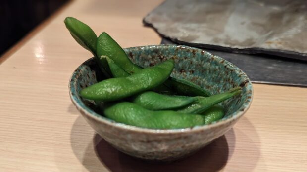 yakiniku-yuji_0119TwitterFacebookはてブPocketLINEコピー 2025.11.25東京渋谷 炭火焼 ゆうじ、おまかせ、生ビール(黒ラベル)/枝豆付き、カットレモン、刺身各種(ハツ刺し[特製醬油タレ、辛子])、キムチ・ナムル(ほうれん草、舞茸)、煮込み、レバー、ホルモン(ごま油、ねぎ、ごま)、牛カシラ、ハラミ、上ミノ、マッコリ、焼きすき ※牛脂付き(サーロインを大きな薄切りに切り出し、特製タレに漬けてた一品。)、牛すじカレー、モナカアイス